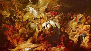 The Destruction of Sennacherib is a poetic rendering of events described in 2 Kings 18-19 and Isaiah 36-37. During the reign of King Hezekiah (716 – 697 BC), the forces of Sennacherib, King of Assyria, descend upon Jerusalem after having mowed down a good chunk of the rest of Judah. Sennacherib’s representative stands at the gate of Jerusalem in front of Israel’s leaders and the people of Jerusalem, beating his chest, uttering threats, offering terms for surrender, mocking the Israelites, even suggesting that Israel’s God was the one who had put him up to it.