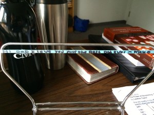 I snapped the image above a while back on the first day back in the office after Sunday’s service. My son likes to leave behind an (often quite entertaining) trail of evidence of his presence at my desk for me to discover the following week. This time it was an elastic band around my book stand. This was, evidently, one of his more optimistic moments.