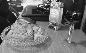 And then, we pulled out a little grape juice box and a whole-wheat bun. We poured the juice into a tiny little goblet and broke the bun into little pieces. We read a passage of Scripture and then we each took a little piece of bread and dipped it in the juice and recited familiar words to one another….