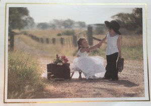 On the shelf beside my desk in my study sits a card with scuffed up edges and faded colours. It’s a rather plain and unassuming, artifact, on the whole. On the front, is a picture of two little kids dressed up as if on their wedding day on a dusty dirt road. The little boy seems to be barely suppressing an awkward grin as he tries to drag the girl along with him wherever he’s going. The little girl has a smile that could melt your heart or save the world, but it looks like she’s not entirely convinced about the entire enterprise. Inside the card, it says something to the effect of Naomi Jade Horii and Ryan Courtney Dueck (yes, Courtney…thanks mom and dad), together with their parents, invite you to a wedding… to share in their joy, on November 25…